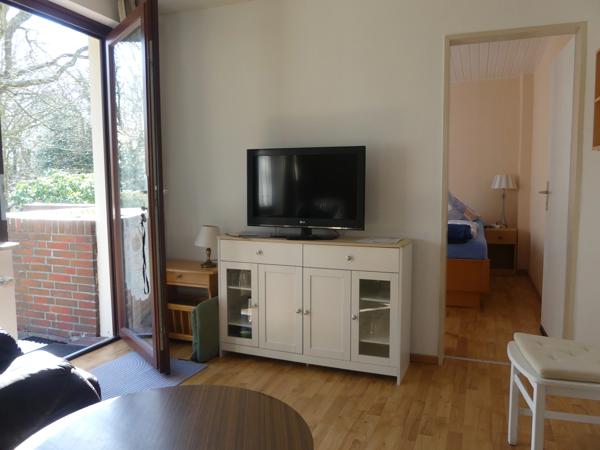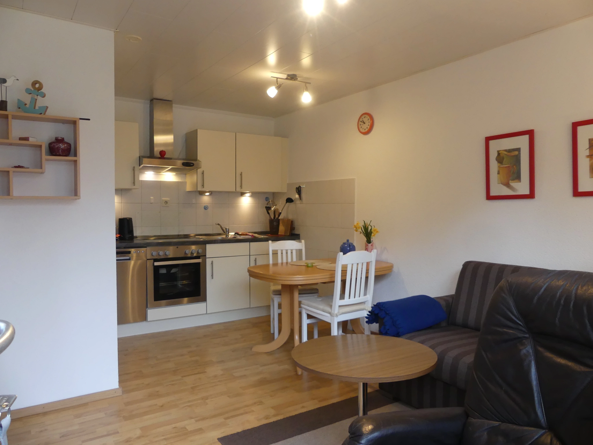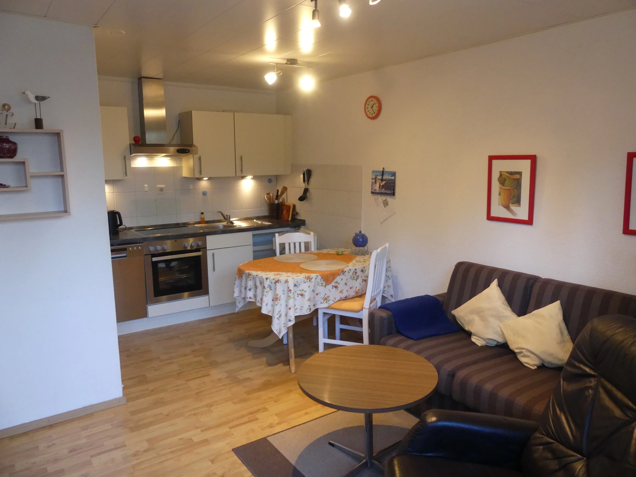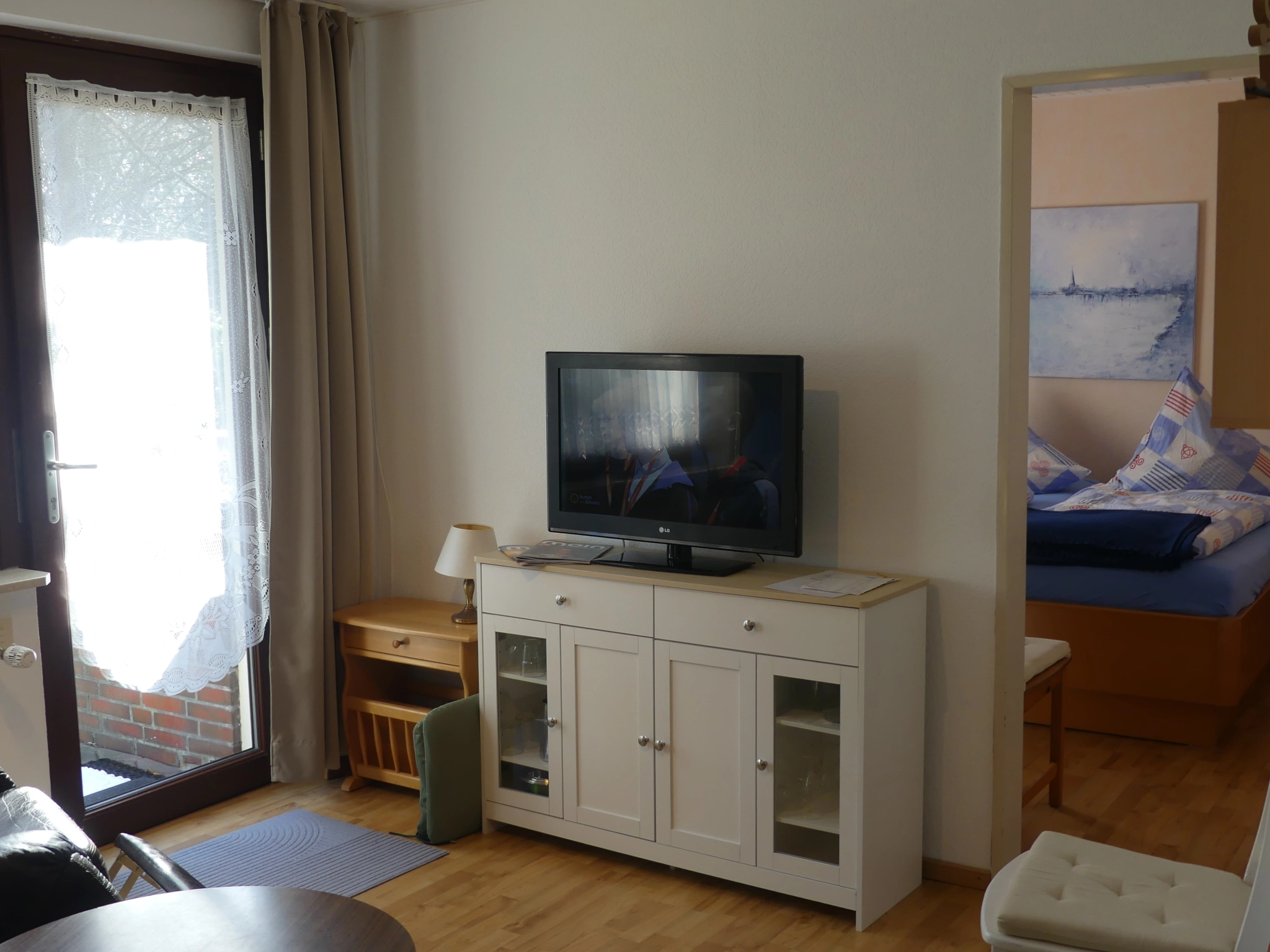 Die Wohnung liegt im Erdgeschoss, ist ca. 45qm groß, für 2 Personen ausgelegt, und hat einen separaten Eingang. Sie besteht aus einem Wohnraum mit Küchenzeile und Esstisch, einer Sitzecke, einem Schlafzimmer mit Doppelbett, sowie einem Badezimmer mit Dusche und WC.