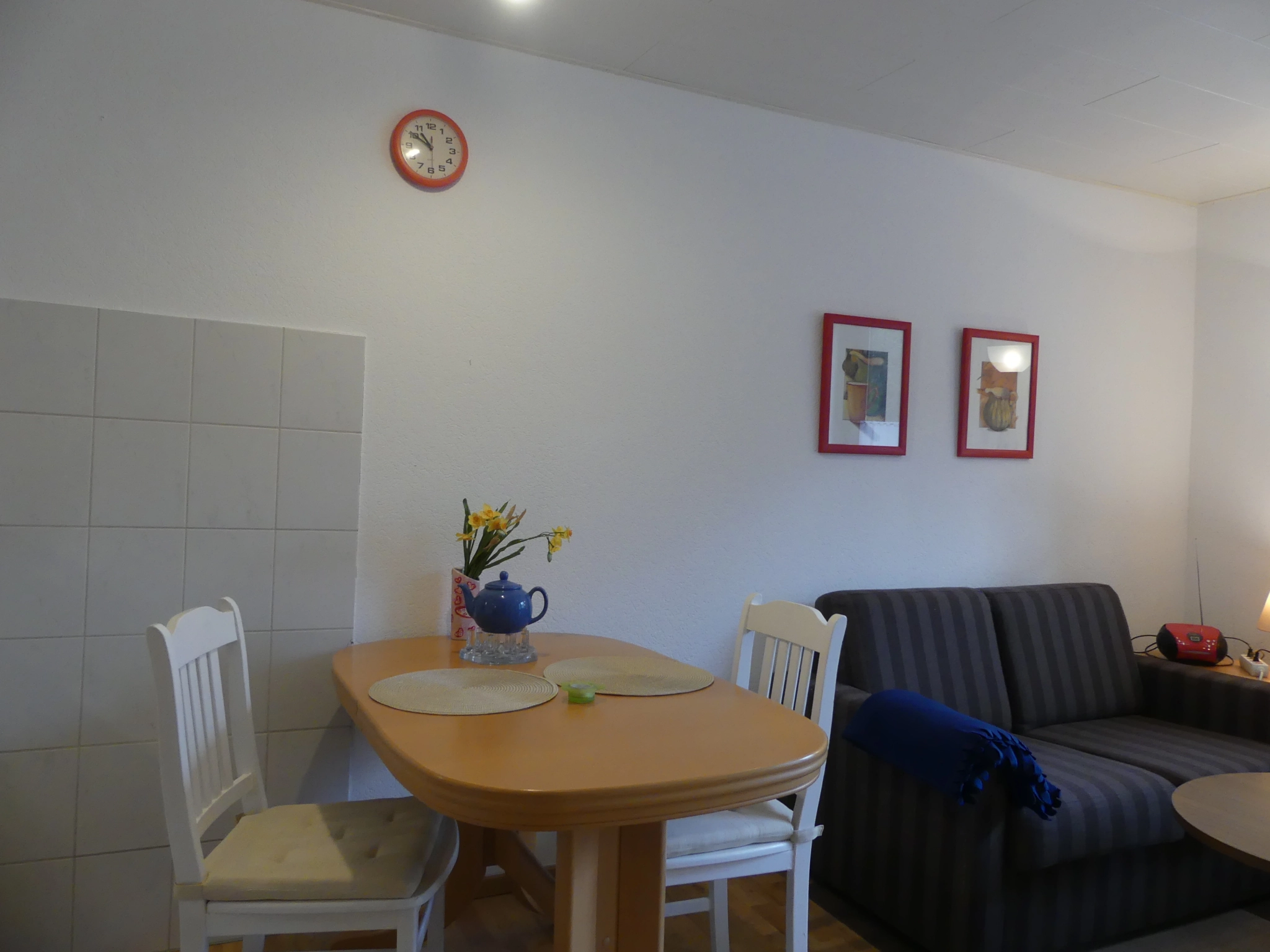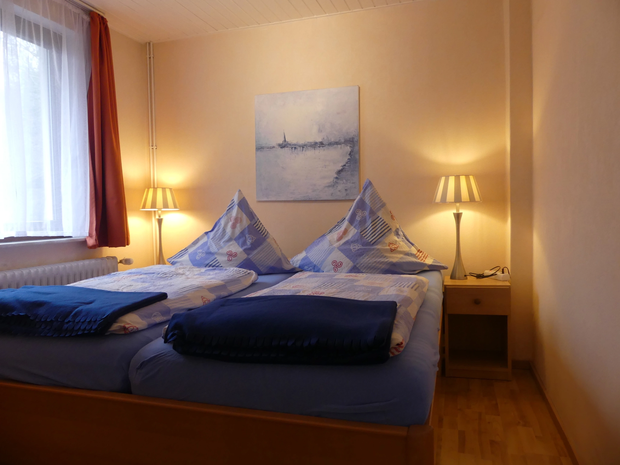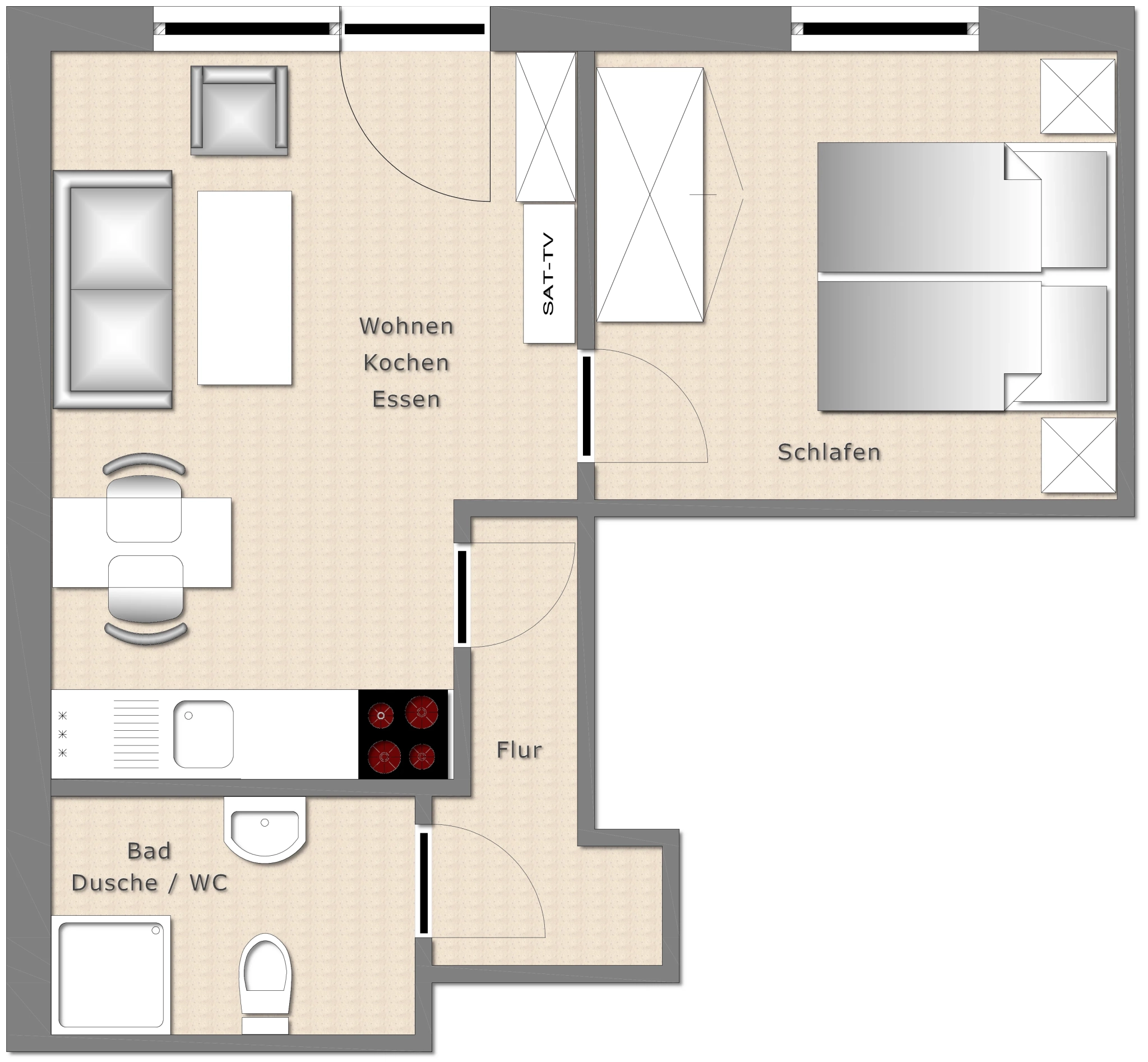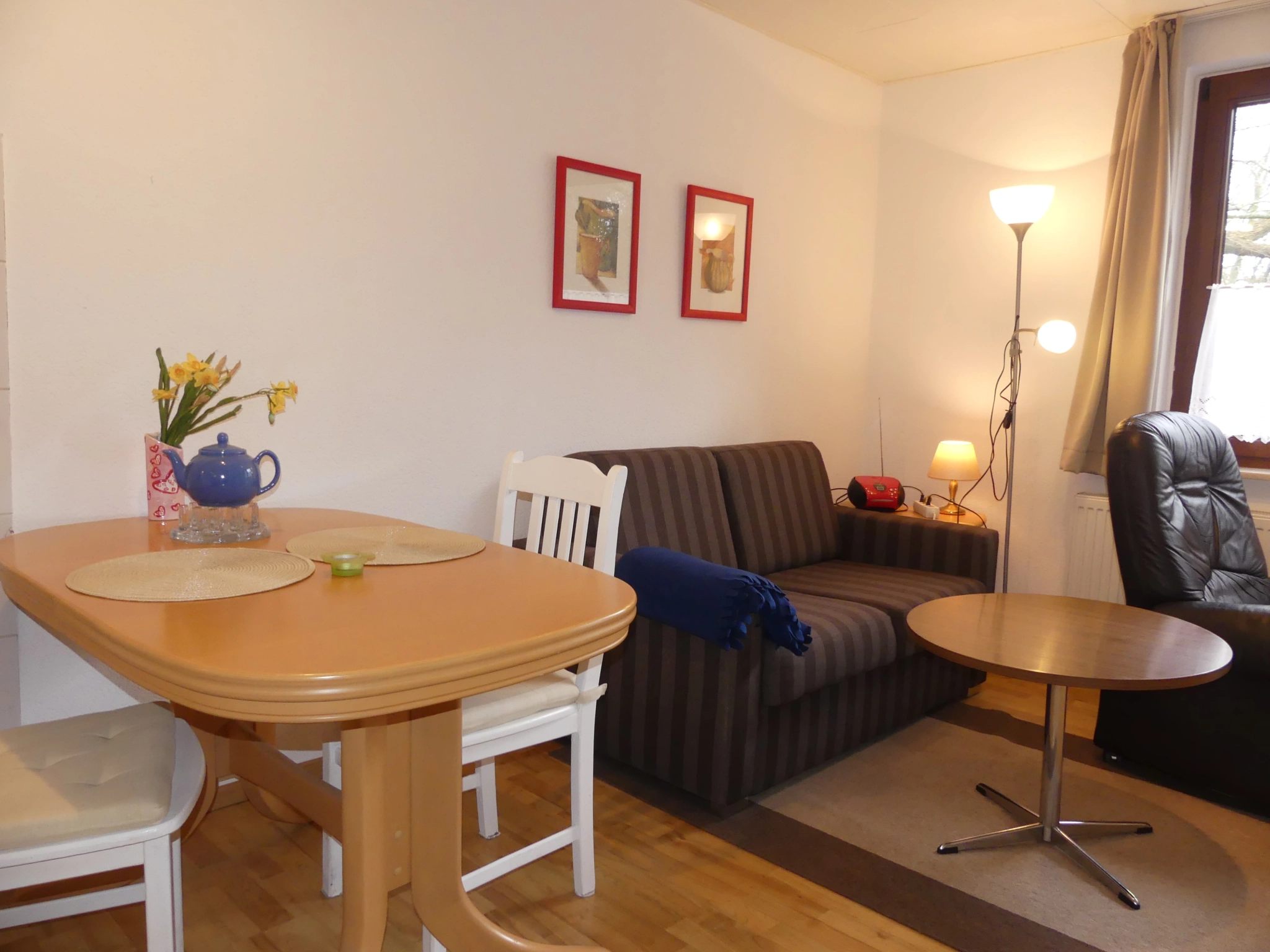Die Wohnung liegt im Erdgeschoss, ist ca. 45qm groß, für 2 Personen ausgelegt, und hat einen separaten Eingang. Sie besteht aus einem Wohnraum mit Küchenzeile und Esstisch, einer Sitzecke, einem Schlafzimmer mit Doppelbett, sowie einem Badezimmer mit Dusche und WC.